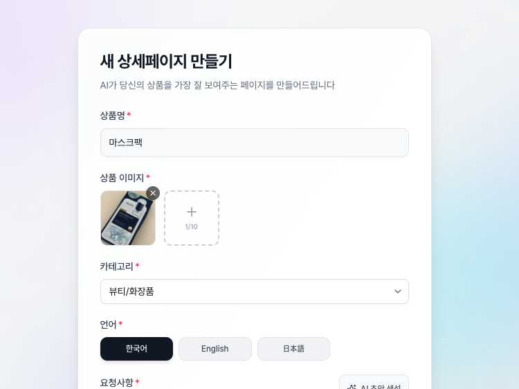 Just enter your product name, image, and category. AI automatically generates professional product pages in minutes — no design tools needed.